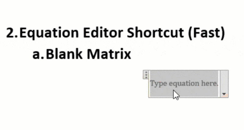 Animation of fastest way to insert matrix in Ms Word using equation editor shortcut. Speed comparison of Two methods to insert 4×4 or larger matrix in Microsoft Word